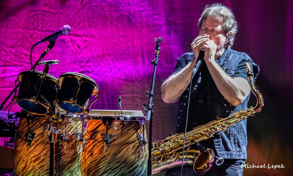 Longtime All-Star band member Warren Ham also showcased his versatility on everything from flute and saxophone to harmonica and backing vocals besides hitting the higher notes on Toto’s “Africa.”  Recent All-Star band recruit and former Aerosmith member Buck Johnson was on keyboards and contributed backing vocals.